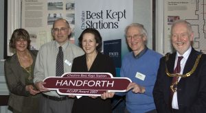 John Hulme, President of Cheshire Best Kept Stations said “I was very saddened to learn of the Barry’s passing and recall many times meeting Barry at our Best Kept Stations events. In 2003, and the first year of Cheshire Best Kept Stations, the Friends of Handforth were commended and there was Barry alongside other Friends receiving the award (see above).